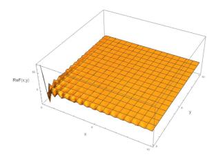 Figure 3. (color online) Plots of integral (77) in 2+1 dimensional U(1) gauge field with light-cone gauge. The left and right figures represent the real and imaginary parts of the integral, respectively. The amplitude of the surface decreases quickly with distance, and the long range contribution can be neglected.