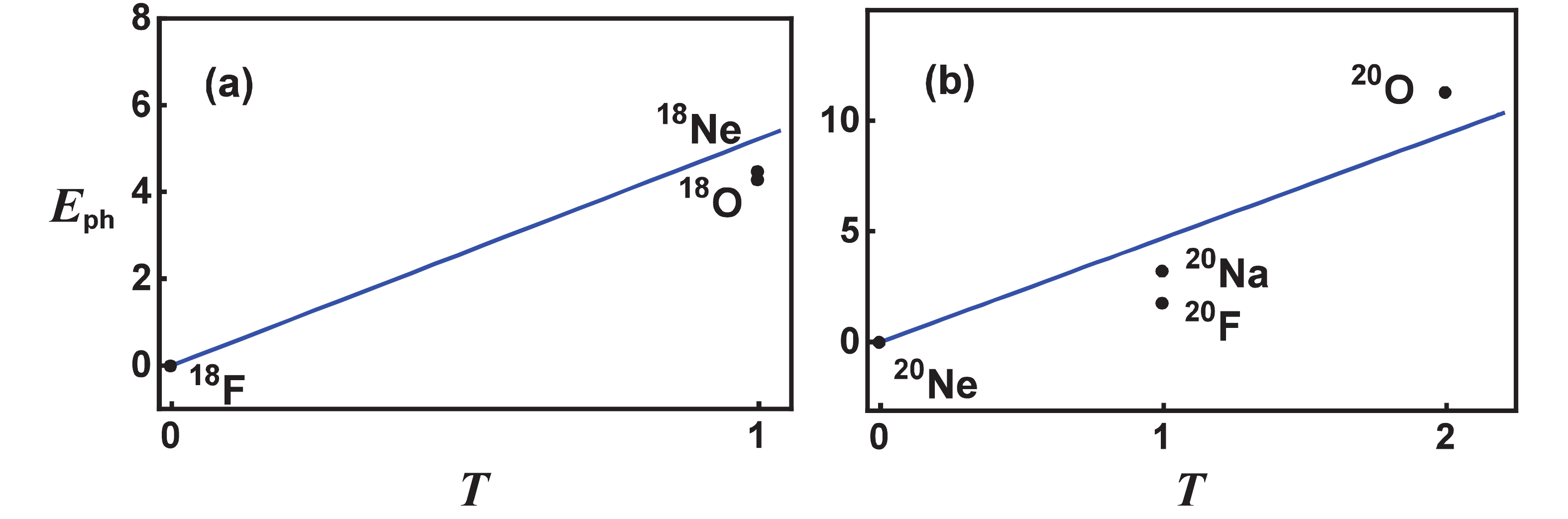 Figure 3.  (color online) The contribution of the particle-hole interaction in MeV (dots) in the binding energy relative to that of $ ^{18}{\rm{F}} $ [panel (a)] and $ ^{20}{\rm{Ne}} $ [panel (b)] versus the ground state isospin T in A = 18 and 20 nuclei. The straight line represents the smooth part of the Wigner energy term in the binding energy [58] with $ E_{\rm {W}} = {47}\vert N-Z\vert/A $ MeV = $ {94} T/A $ MeV.