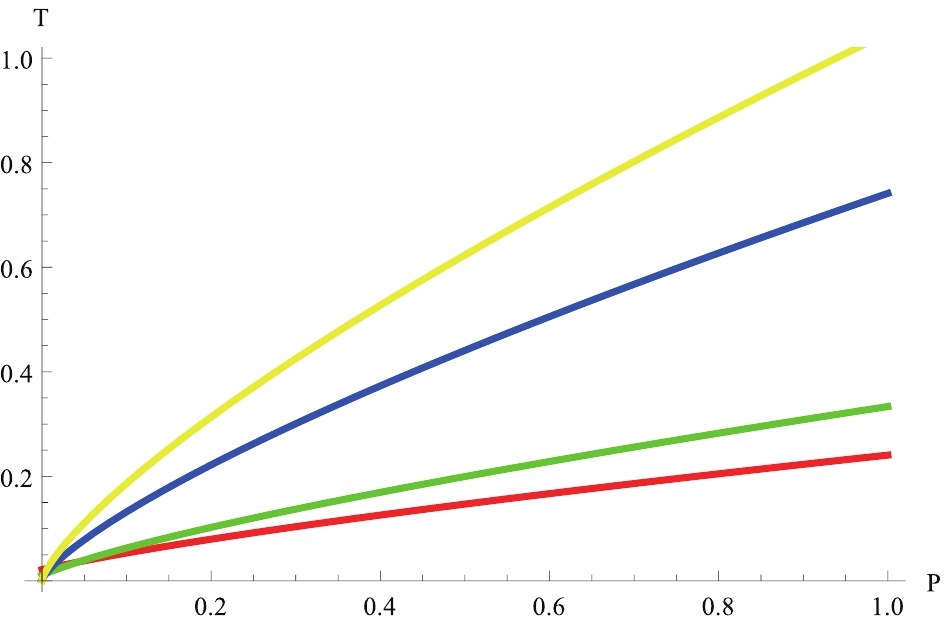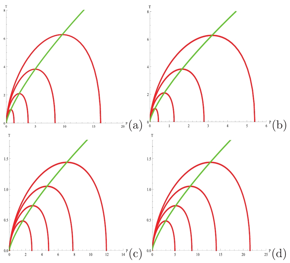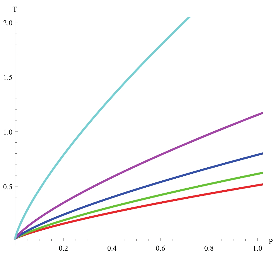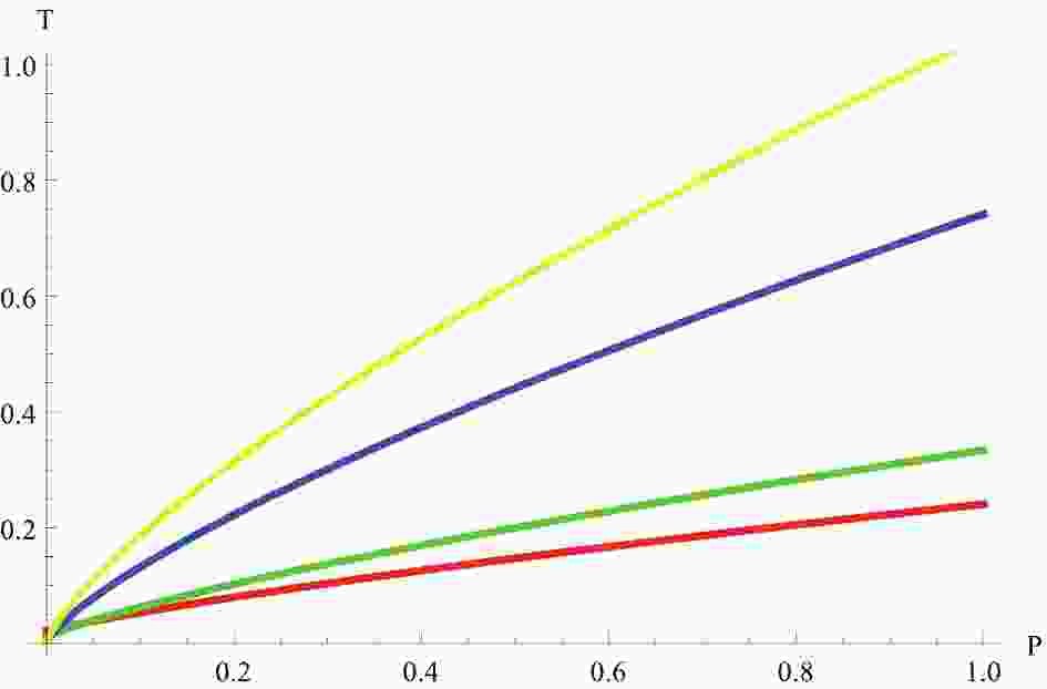 In this section, we consider the Joule-Thomson expansion of a charged AdS black hole in the Rastall gravity. In [29], the Joule-Thomson expansion is considered as a process with constant enthalpy, and the black hole mass is taken as the enthalpy in the AdS space. The Joule-Thomson coefficient $ \mu $ is then given by$ \mu = {\Big(\frac{\partial T}{\partial P}\Big)}_{H} = {\Big(\frac{\partial T}{\partial P}\Big)}_{M}. $  (22) We can determine the cooling-heating regions from the sign of $ \mu $ . The pressure always decreases during expansion, so the change in pressure is always negative. However, the temperature may decrease or increase during the expansion. Therefore, the change in temperature determines the sign of$ \mu $ . If$ \mu $ is negative (positive), heating (cooling) occurs, and the gas warms (cools).The Joule-Thomson coefficient can also be given by [29] $ \mu = {\Big(\frac{\partial T}{\partial P}\Big)}_{H} = \frac{1}{C_p}\Big[T \Big({\frac{\partial V}{\partial T}}\Big)_p-V\Big]. $  (23) Setting $ \mu = 0 $ , we obtain the inversion temperature of the black hole, i.e.$ T_{i} = V {\Big(\frac{\partial T}{\partial V}\Big)}_{P}. $  (24) Combining Eq. (8) and Eq. (9), the inversion temperature Eq. (24) is given by $ T_i = \frac{Q^{2}}{4\pi r_+^{3}}-\frac{1}{12\pi r_+}-\frac{2P r_+}{3(4\lambda-1)}. $  (25) On the other hand, according to the definition of the temperature Eq. (8), the inversion temperature can also be given by $ T_i = -\frac{Q^{2}}{4\pi r_+^{3}}+\frac{1}{4\pi r_+}-\frac{2P r_+}{4\lambda-1}. $  (26) Subtracting Eq. (25) from Eq. (26), yields the identity $ -3Q^{2}+2r_+^{2}+\frac{8\pi P r_+^{4}}{1-4\lambda} = 0. $  (27) Solving Eq. (27), we get four roots of $ r_+ $ . Only one root is physically meaningful, and is given by$ r_+ = \frac{1}{2\sqrt{2}}\sqrt{\frac{4\lambda-1}{P\pi}+\sqrt{\frac{(4\lambda-1)(4\lambda-1-24P \pi Q^{2})}{P\pi}}}. $  (28) Substituting the radius $ r_+ $ from Eq. (28) into Eq. (26), we obtain$ T_i = \frac{1-4\lambda+16\pi P Q^2-\sqrt{(4\lambda-1)(4\lambda-1-24\pi P Q^2)}}{\sqrt{2\pi}P\big(\frac{4\lambda-1+\sqrt{(4\lambda-1)(4\lambda-1-24P\pi Q^{2})}}{P}\big)^{\frac{3}{2}}}. $  (29) The minimum inversion temperature occurs at the point $ P_i = 0 $ [29], and is given by$ {T_{i}}^{\rm min} = \frac{1}{6\sqrt{6}\pi Q}. $  (30) Therefore, for a charged AdS black hole in the Rastall gravity, the inversion temperature $ {T_{i}} $ is related to the Rastall parameter$ \lambda $ , but the minimum inversion temperature$ {T_{i}}^{\rm min} $ is independent of the Rastall parameter$ \lambda $ , as is the case for the Einstein gravity where$ \lambda = 0 $ .The ratio between the minimum inversion temperature and the critical temperature is $ \varepsilon = \frac{{T_{i}}^{\rm min}}{T_{c}} = \frac{1}{2}. $  (31) Obviously, the ratio $ \varepsilon $ between the minimum inversion temperature and the critical temperature of a charged AdS black hole in the Rastall gravity is independent of the Rastall parameter$ \lambda $ .We plot the inversion curves in the $ T-P $ plane in Fig. 1. For$ \lambda = -1 $ , we show the inversion curves for different charges$ Q $ . Obviously, the inversion temperature increases with increasing$ Q $ for the same inversion pressure. The inversion curves have a positive slope, which is consistent with AdS black holes in the Einstein gravity.  Figure 1. (color online) Inversion curves for $\lambda = -1$ . From bottom to top, the inversion curves correspond to Q = 1,2,10,20.In Fig. 2, the inversion curves are shown for $ Q = 1 $ and for Rastall parameters$ \lambda = -0.2, -0.1, 0, 0.1,0.2 $ . Clearly, the inversion temperature increases with increasing$ \lambda $ for the same inversion pressure. When$ \lambda $ decreases, we also find that the slope of the inversion curves decreases. In other words, for the same pressure, a smaller$ \lambda $ implies a lower inversion temperature.  Figure 2. (color online) Inversion curves for Q = 1. From bottom to top, the inversion curves correspond to $\lambda = -0.2,-0.1,0,0.1,0.2$ .In Fig. 3, we show the isenthalpic and inversion curves of a charged AdS black hole in the Rastall gravity. The isenthalpic curves are divided by the inversion curves into two parts: the upper part is the cooling region, and the lower part is the heating region. The inversion points of the isenthalpic curves increase with increasing $ M $ and the Rastall parameter$ \lambda $ .  Figure 3. (color online) Isenthalpic and inversion curves of a charged AdS black hole in the Rastall gravity. The green lines are the inversion curves. From bottom to top, the red isenthalpic curves correspond to the increasing values of M. (a) $Q = 1$ ,$\lambda = 0.1$ and$M = 2,2.5,3,3.5$ , (b)$Q = 1$ ,$\lambda = 0.2$ and$M = 2, 2.5, 3, 3.5$ , (c)$Q = 2$ ,$\lambda = -1$ and$M = 4,4.5,5,5.5$ , (d)$Q = 2$ ,$\lambda = -2$ and$M = 4,4.5,5,5.5 .$
