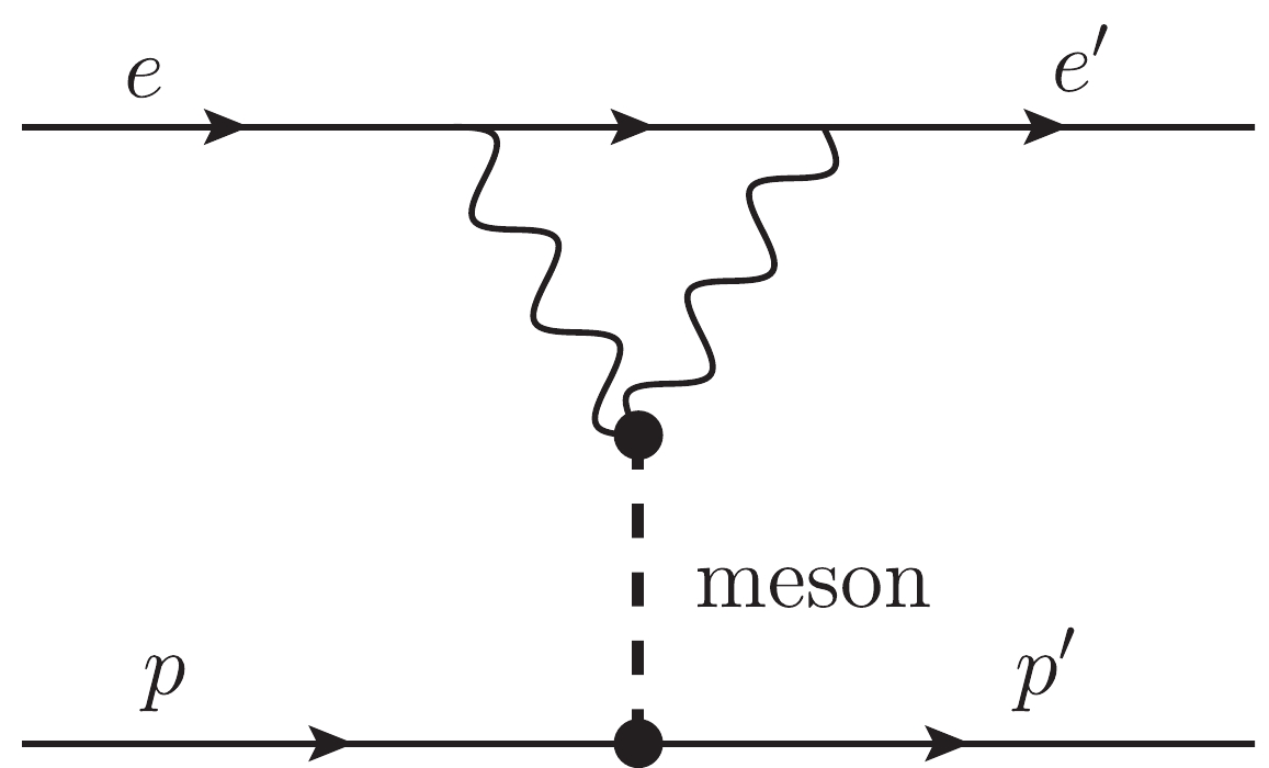 $ \alpha_e = e^2/4\pi $ . The final results$ {\cal F}_i^{(1\gamma)} $ are free from kinematic singularities in$ {\cal D}^{-1} $ when$ {\cal F}_i^{(1\gamma)} $ continues to the complex plane of$ \nu $ . In contrast,$ {\cal F}_i^{(1\gamma)} $ are only dependent on$ Q^2 $ , and their imaginary parts are exactly zero. This means that they obey the once-subtracted DRs on$ \nu $ .When going beyond the OPE approximation, the TPE effect must be considered. In this study, we do not consider TPE contributions from the baryon resonances and