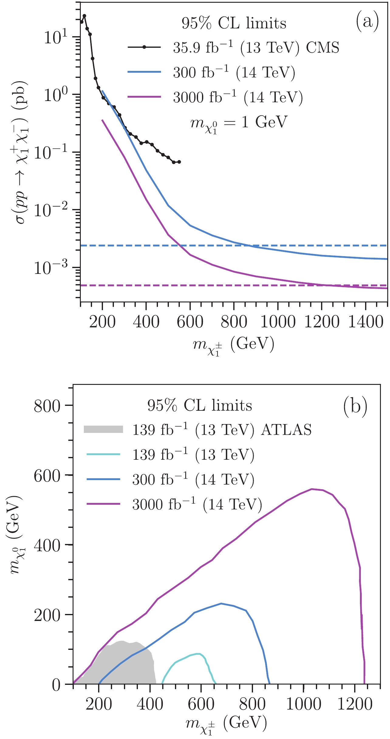 To demonstrate the power of our method, we considered chargino ( $ \chi_1^\pm $ ) pair production in a simplified supersymmetric extension of the SM in which the$ \chi_1^\pm $ is assumed to decay entirely via the mode of$ \chi_1^\pm \to W^\pm \chi_1^0 $ , i.e., the branching ratio$ {\rm{Br}}(\chi_1^\pm \to W^\pm \chi_1^0) = 1 $ . The neutralino$ \chi_1^0 $ is the DM candidate. In this study, we calculated the cross section of the chargino pair production with the assumption that it is a pure wino.When the mass split between the chargino and neutralino is large, for example $ \Delta m \gtrsim 100\; {{\rm{GeV}}} $ , it yields a signature of multiple leptons plus$ {{\not\!\! E}}_{ T} $ , which has been measured by the ATLAS [26-28] and the CMS collaboration [29, 30]. In the CMS collaboration analysis, the neutralino mass was set to 1 GeV, i.e.,$ m_{\chi_1^0} = 1 $ GeV, in order to obtain an upper bound of$ \sigma(\chi_1^+\chi_1^-) $ as a function of$ m_{\chi^\pm_1} $ at the 13 TeV LHC with$ {\cal{L}} = 35.9\; {\rm{fb}}^{-1} $ [29]; see the black-dotted curve in Fig. 3(a). Following the CMS group, we set$ m_{\chi_1^0} = 1 $ GeV and performed a collider simulation of the signature of the two boosted W-jets and$ {{\not\!\! E}}_{ T} $ . The blue and magenta curves denote the projected upper limit derived from the signature of two W-jets plus$ {\not\!\!{ E}}_{ T} $ at the 14 TeV LHC with$ {\cal{L}} = 300 $ and$ 3000\; {\rm{fb}}^{-1} $ , respectively. The boosted W-jet method efficiently increases the sensitivity in the search for the$ \chi_1^+\chi_1^- $ pair when$ m_{\chi^\pm_1}\geqslant 200\; {\rm{GeV}} $ for two reasons. The first is the strong efficiency of the reconstruction of the boosted W-jets, and the second is the large suppression of the QCD background [52-55]. From Eq. (5) and the event numbers of the backgrounds, we obtained the$ 2\sigma $ bound on the$ \sigma(\chi_1^+\chi_1^-) $ and$ m_{\chi_1^\pm} $ for a massless$ \chi_1^0 $ as follows:  Figure 3. (color online) (a) Upper limits of $ \sigma(\chi_1^+ \chi_1^-) $ as a function of$ m_{\chi_1^\pm} $ at the 95% confidence level at the LHC with an integrated luminosity of$ 300\; {\rm{fb}}^{-1} $ (blue) and$ 3000\; {\rm{fb}}^{-1} $ (magenta) with$ m_{\chi_1^0} = 1 $ GeV and$ {\rm{Br}}(\chi_1^+\to W^+\chi_1^0) = 1 $ . The black dotted curve denotes the current limit obtained from the mode of multiple leptons plus${\not\!\!{ E}}_{ T}$ . (b) Contours of the upper limit of$ \sigma(\chi_1^+\chi_1^-) $ in the plane of$ m_{\chi_1^\pm } $ and$ m_{\chi_1^0} $ .$ \sigma(\chi_1^+\chi_1^-)\leqslant 2.4\; {\rm{fb}}, \;\;\;\;\;\; m_{\chi_1^\pm}> 870\; {\rm{GeV}}, $  with $ {\cal{L}} = 300\; {\rm{fb}}^{-1} $ and$ \sigma(\chi_1^+\chi_1^-)\leqslant 0.48\; {\rm{fb}}, \;\;\;\;\;\; m_{\chi_1^\pm}> 1240\; {\rm{GeV}}, $  with $ {\cal{L}} = 3000\; {\rm{fb}}^{-1} $ ; see the blue and magenta dashed horizontal lines.The results of a massive $ \chi^0_1 $ are shown in Fig. 3(b), which plots the excluded regions in the plane of$ m_{\chi_1^\pm} $ and$ m_{\chi_1^0} $ at the 95% confidence level. The gray region is excluded in the signal signature of multi-leptons plus$ {\not\!\!{ E}}_{ T} $ at the 13 TeV LHC with an integrated luminosity of 139 fb−1 [27]. The region under the cyan curve is excluded by our method at the 13 TeV LHC with an integrated luminosity of 139 fb−1. Clearly, our method works better in the region of heavy$ \chi_1^\pm $ with a large mass split,$ \Delta m $ . The region under the blue curve is excluded at the 14 TeV LHC with an integrated luminosity of 300 fb−1. The efficiency of the W-jet reconstruction increased with$ \Delta m = m_{\chi_1^\pm}-m_{\chi_1^0} $ , and the production rate of$ \chi_1^+\chi_1^- $ pairs decreased rapidly with$ m_{\chi_1^+} $ . The two effects compete with each other and here yielded a peak around$ m_{\chi_1^+}\sim 700\; {\rm{GeV}} $ ; see the blue curve. Accumulating 10 times more data, i.e., increasing the integrated luminosity to$ 3000\; {\rm{fb}}^{-1} $ , the peak position was shifted to$ m_{\chi_1^\pm}\sim 1100\; {\rm{GeV}} $ . It is evident that the signature of two W-jets plus$ {{\not\!\! E}}_{ T} $ is a better method than the conventional mode of multiple leptons plus$ {\not\!\!{ E}}_{ T} $ ; the magenta curve covers a vast parameter space including the gray region. Therefore, we recommend that the signature of the two W-jets plus$ {{\not\!\! E}}_{ T} $ should be used to search for a heavy resonance.