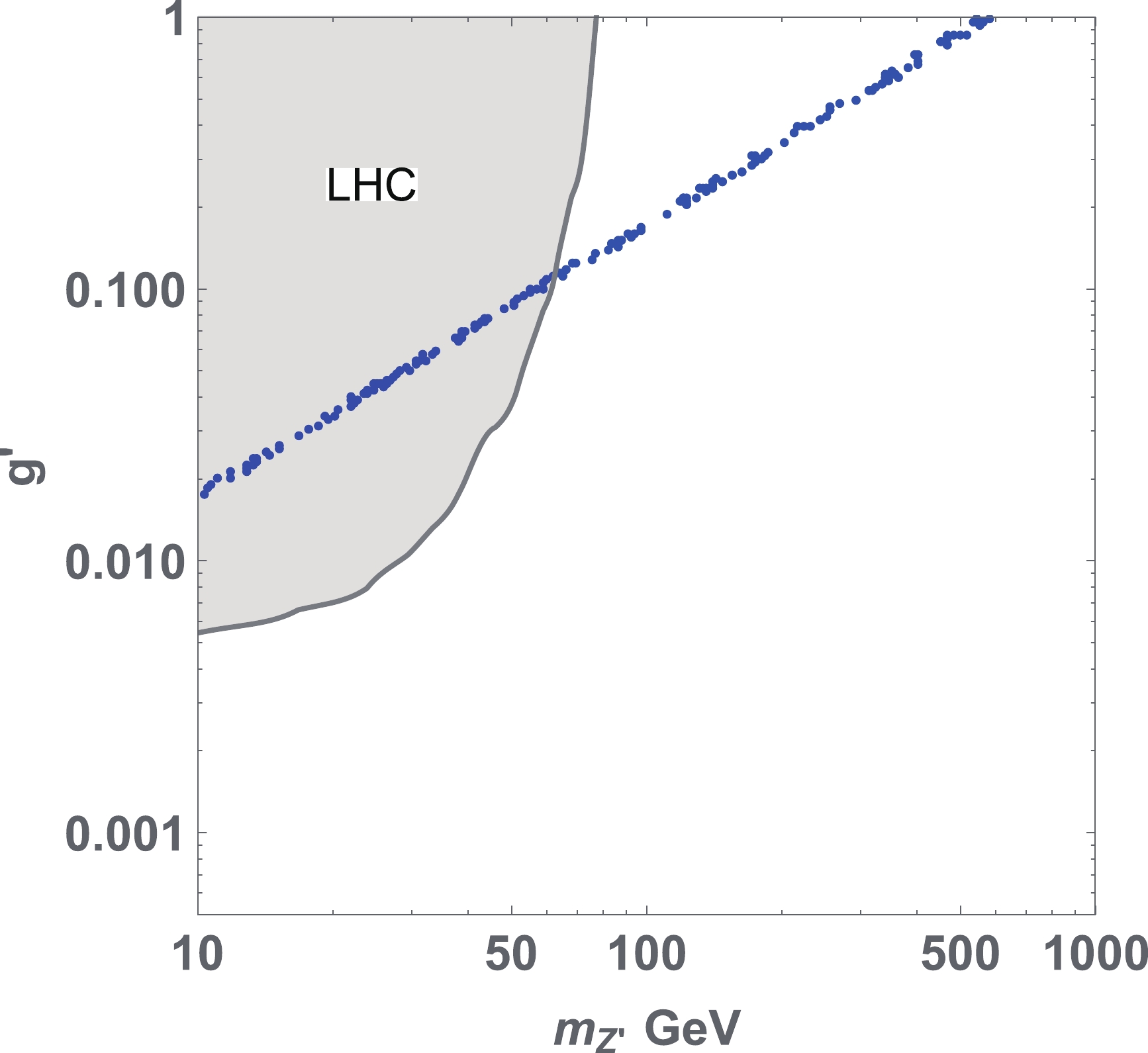 $ Z' $ . The gauge coupling and$ Z' $ mass are restricted by the neutrino trident process$ \nu N \to \nu N \mu^+ \mu^- $ , where N is a nucleon [6, 118]. The approximated bound is given by$ m_{Z'}/g' \gtrsim 550 \ {\rm {GeV}} $ for$ m_{Z'} > 1 $ GeV, and we apply the bound in our numerical analysis below.The gauge interaction is also constrained by the LHC experiment searching for the signal of