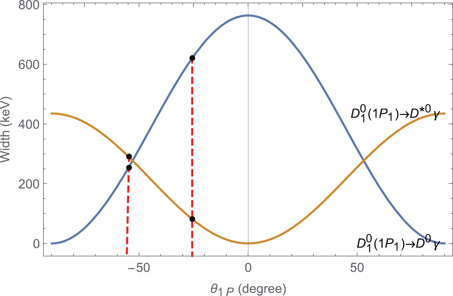 Figure 2.  (color online) Width of the process $ D^{0}_{1}(1P_{1}) \to $$ D^{*0}/D^{0}\gamma $ depending on the mixing angle $ \theta_{1P}. $