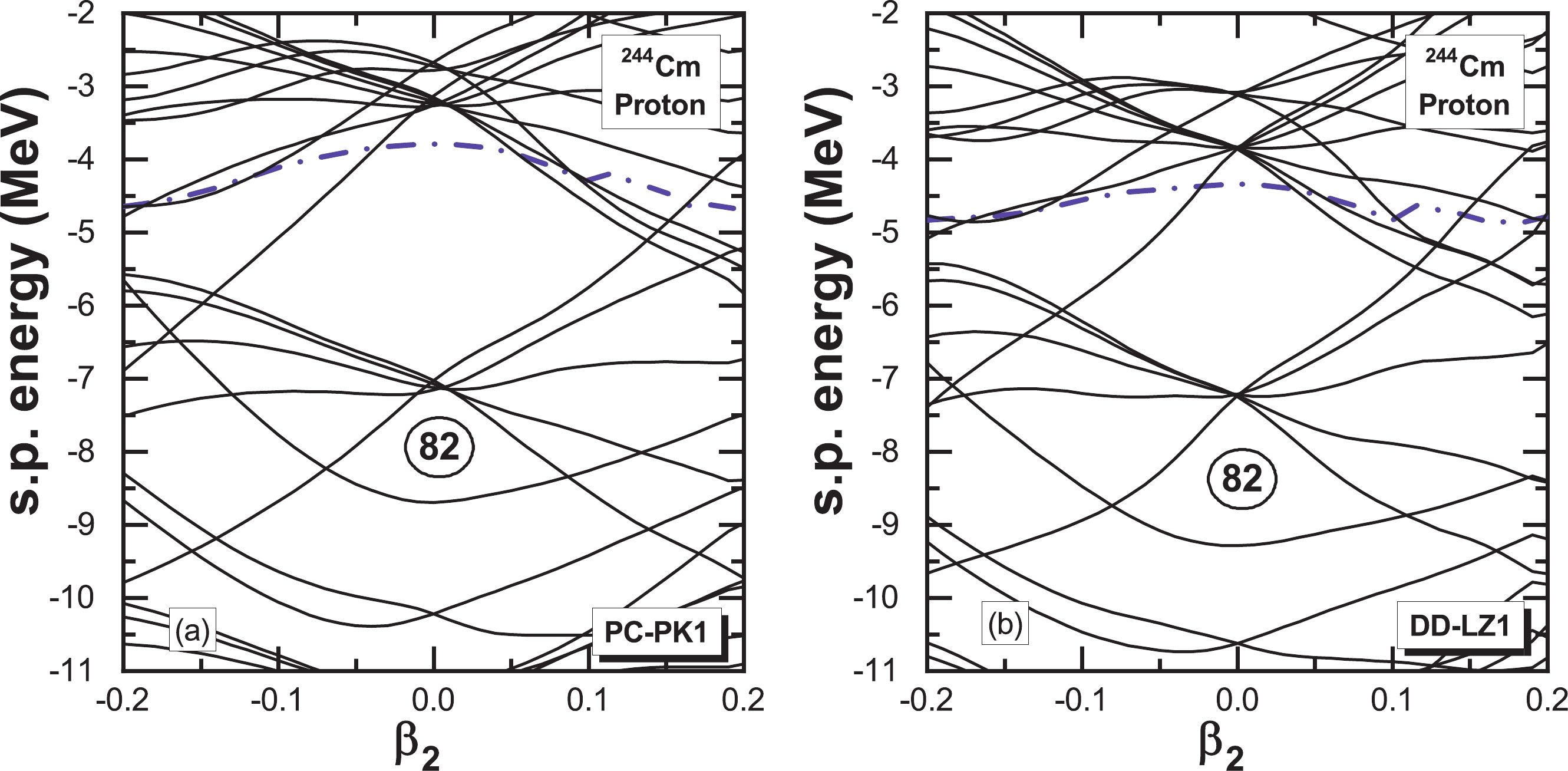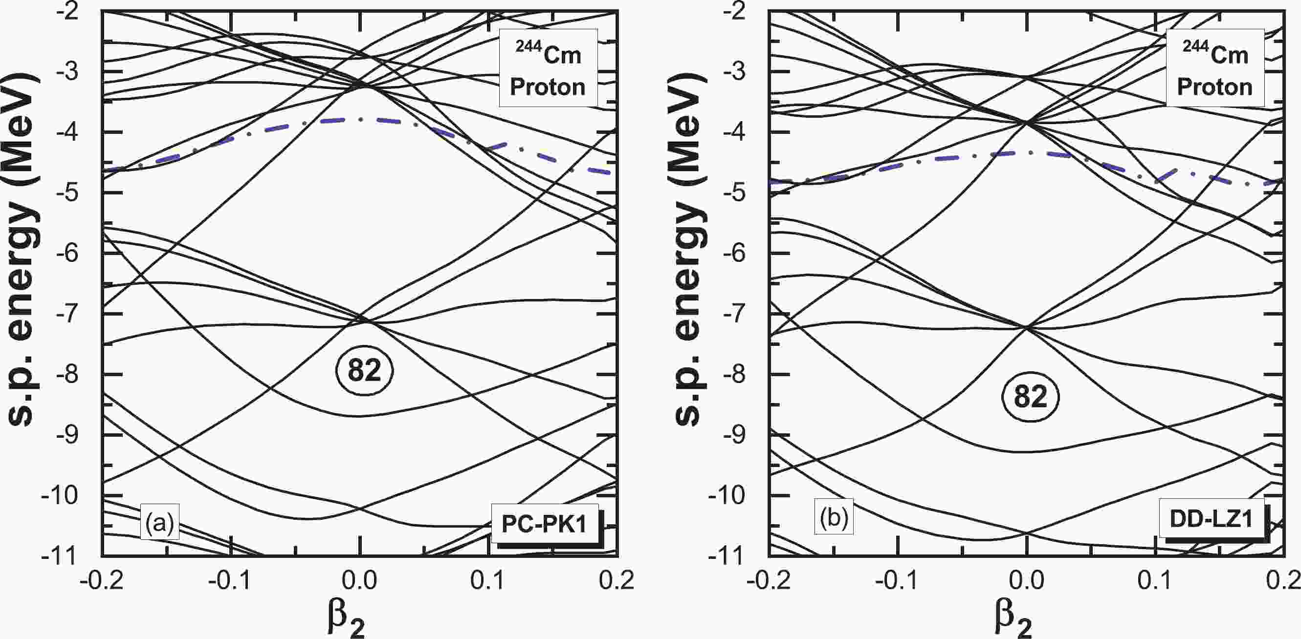$ ^{244} $ Cm, which is close to$ Z=92 $ , as an example, the proton single-particle levels obtained using different density functionals are demonstrated in Fig. 1. The result obtained using another density functional PC-PK1 [68] is compared side by side. The spurious shell gap at spherical$ Z=92 $ is significantly larger than that at$ Z=82 $ with a ratio of$ 3.7 / 1.6 \approx 2.3 $ for the density functional PC-PK1, whereas such a gap ratio reduces to$ 3.2 /2.2 \approx 1.5 $ for the density functional DD-LZ1. It is well accepted that the sizable structural change of spherical shell gaps affects not only the properties of spheroidal nuclei but also the properties of neighboring deformed nuclei. For example, on the prolate side of this figure, the crossings of the upward levels belonging to$ 1h_{9/2} $ and the downward levels belonging to$ 1i_{13/2} $ move from large deformations for PC-PK1 to small deformations for DD-LZ1. The first crossing is at ($ \beta_2=0.14, \;E_{\rm{s.p.}}=-5.10 $ MeV) for PC-PK1, and the corresponding crossing is located at ($ \beta_2=0.11, E_{\rm{s.p.}}=-5.45 $ MeV) for DD-LZ1. Thus, the ground states of nuclei near$ Z=92 $ , along with gaps enclosed by upward and downward single-particle levels, will be substantially altered. Another treatment for spurious shell closures is related to the Lorentz tensor ρ-field in relativistic Hartree-Fock theory [70] with high computational cost.In the RMF calculations, a large major shell number