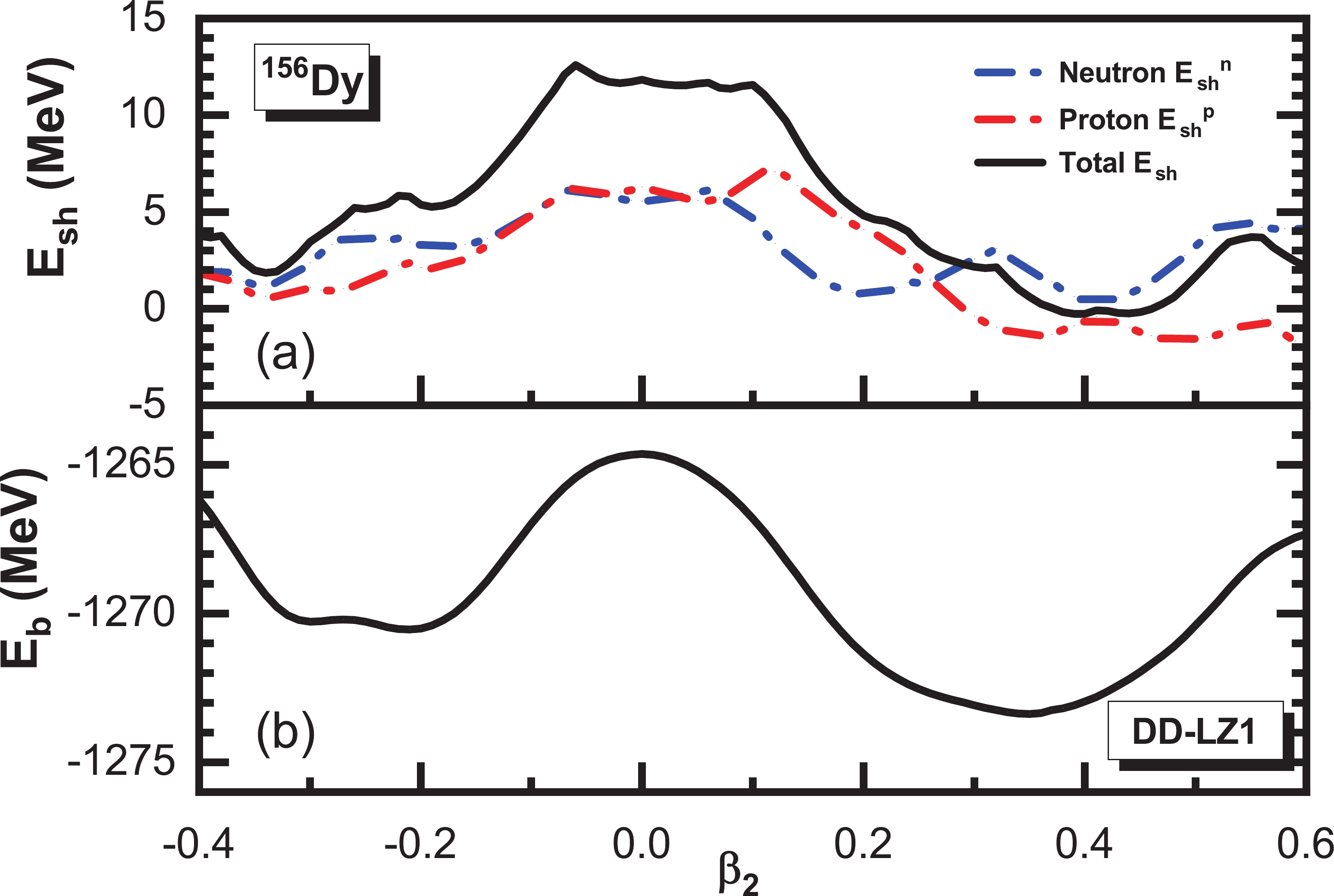 $ ^{156} $ Dy as an example, the neutron and proton shell correction energies as well as the binding energy as functions of quadrouple deformation$ \beta_2 $ are plotted in Fig. 2. For the shell correction energies, a valley of several MeV in depth is localized near$ \beta_2 \approx 0.2 $ and$ \beta_2 \approx 0.4 $ for neutrons, whereas a flat plain between$ \beta_2 \approx 0.35 $ and$ \beta_2 \approx 0.5 $ can be found for protons. Consequently, the total shell correction energy curve has a minimum at$ \beta_2=0.39 $ , which is similar to the potential energy curve with a close minimum at$ \beta_2=0.35 $ . The (total) shell correction energy$ E_{\rm{sh}} $ , as a quantitative quantity representing shell effects, normally has a minimum near the ground state on the potential energy curve. In the following calculation, the shell correction energies are based on the single-particle levels taken from the ground states obtained in axial deformed RMF theory.