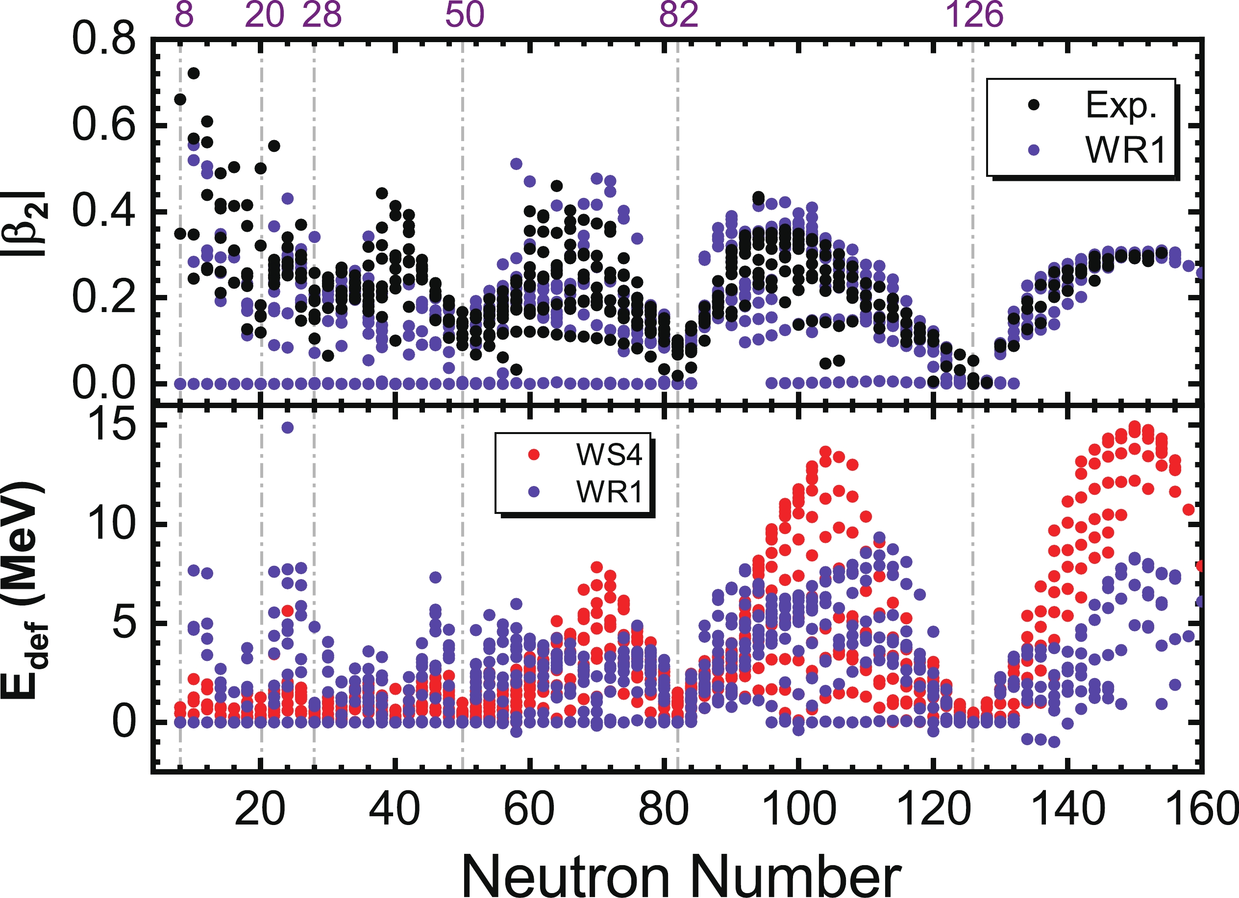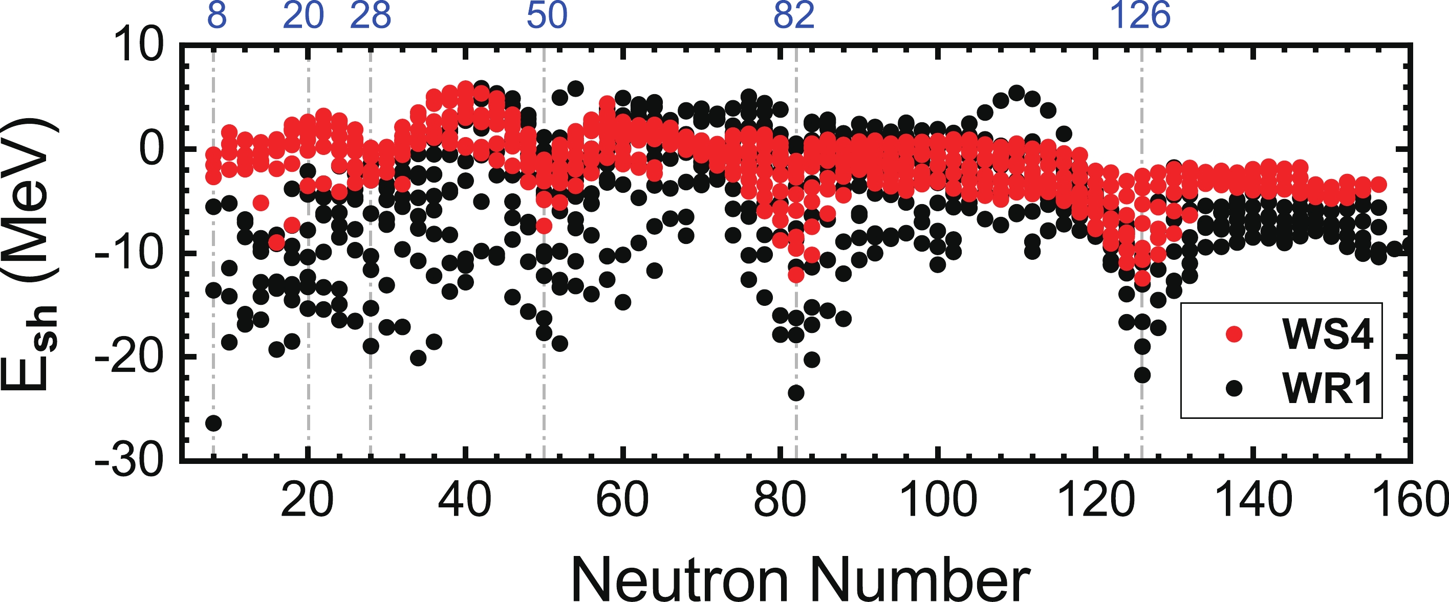Figure 5 shows the total shell correction energy obtained using WS4 and the current calculation, denoted as WR1. For the WS4 mass model,