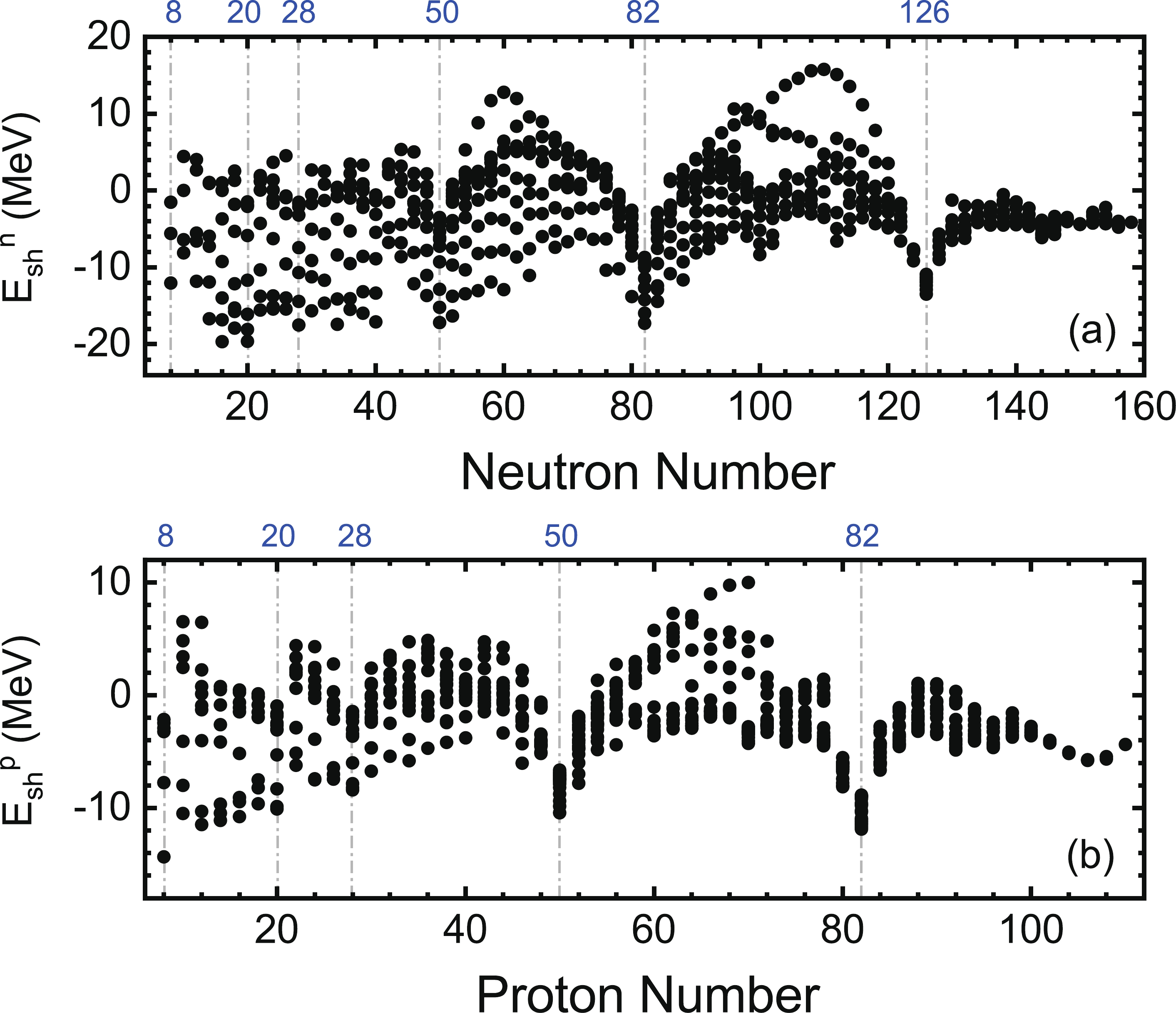 Next, the neutron (proton) shell correction energy as a function of neutron (proton) number is plotted in Fig. 4. The shell correction energies demonstrate a valley at exactly each magic number. This is also the reason for using shell correction energy as an indicator for magic numbers in Ref. [35]. The neutron shell correction energies exhibit wide spreading, while the proton counterparts are narrow.