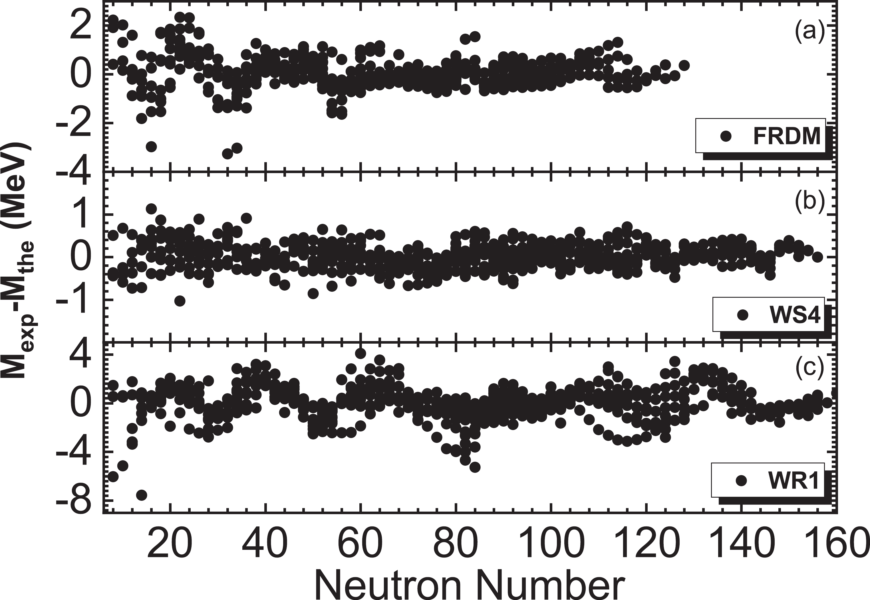 $ \sigma^{2}=\dfrac{1}{N} \sum\bigg[M_{\rm{exp}}^{(i)}- M_{\rm{the}}^{(i)}\bigg]^{2} $ , and the deviation between the theoretical mass$ M_{\rm{the}} $ and experimental data$ M_{\rm{exp}} $ for the FRDM, WS4, and WR1 models are shown in Fig. 6. Compared with FRDM and WS4, the deviation is typically overbinding for open-shell nuclei and underbinding near the magic numbers. Note that the scales of the three mass models are different.If we take the AME2016 version of the experimental data [79], similar parameters are obtained, and the deviations between the theoretical mass and experimental data are generally within 2 MeV for new nuclei appearing in AME2020.