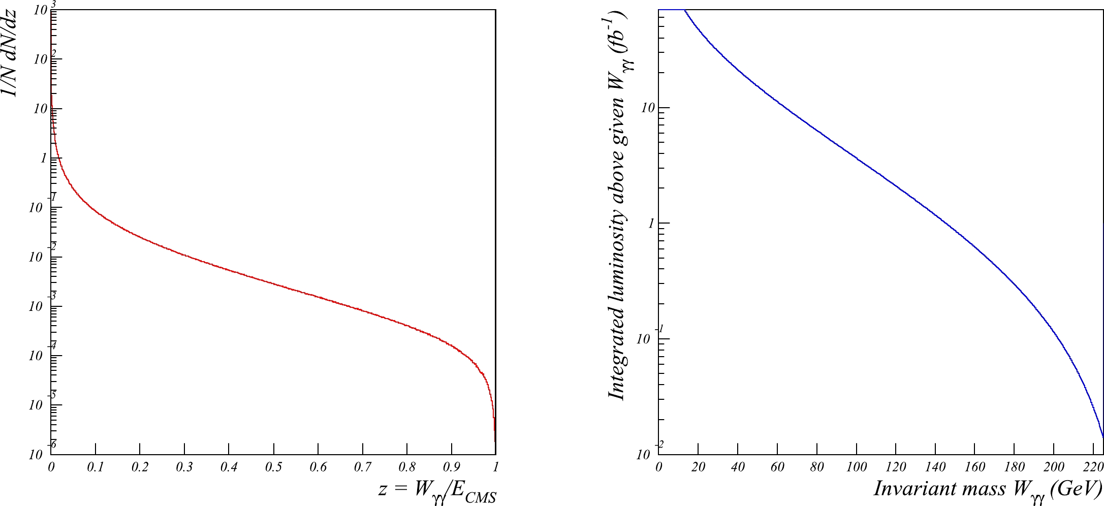 $ q^2_i $ invariant mass of emitted photons indicates that the scattered leptons proceed undetected (so called no-tag events); however, owing to the large cross-section of the process, no-tag events can be selected even without full final state recovery [13] using the requirements of the small total transverse momentum of the produced system and the small value of its invariant mass ($ W\ll 2E $ ). Gamma-gamma collisions tend to occur at c.m.s. energies significantly lower than the nominal collider energy, as shown in Fig. 2 (left). Nevertheless, the amount of collisions at high energies is also significant and can be used to study different aspects of two-photon physics.