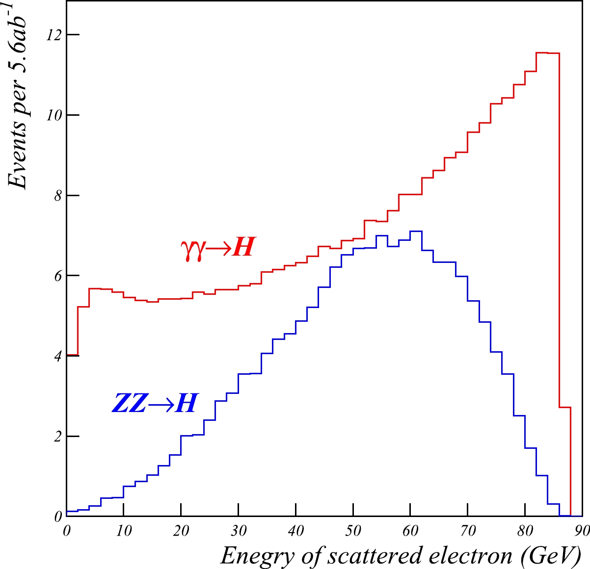 $\gamma\gamma \rightarrow H$ signal and$ZZ \rightarrow H$ background. The number of events is normalized to an integrated luminosity of 5.6 ab$^{-1}$ .Figure 5 shows the energy distribution of the scattered beam particles with a scattering angle between 30 mrad and 24