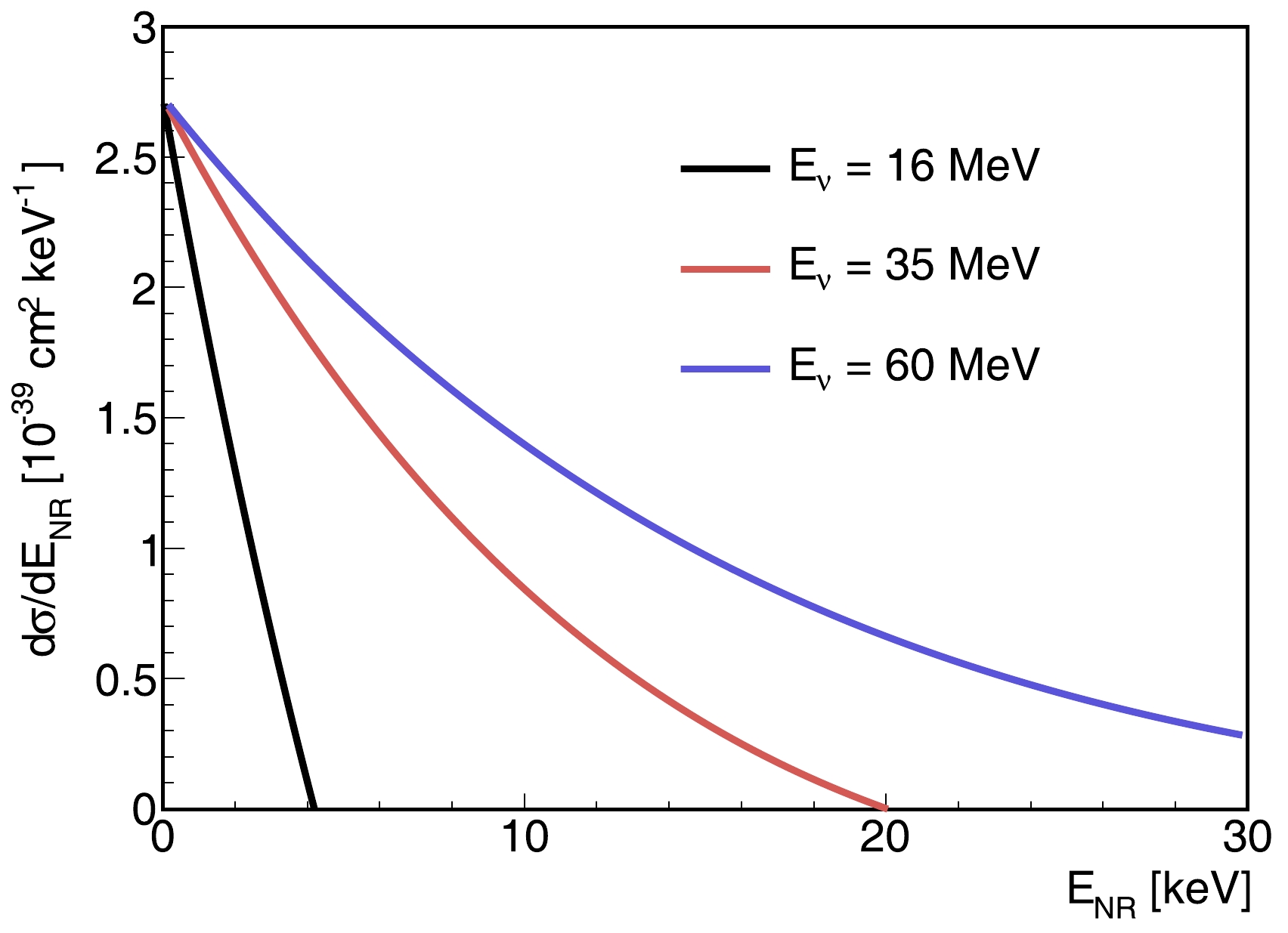 $ \begin{split} \frac{{\rm d}N_{0}}{{\rm d}E_{\rm NR}}(E_{\rm NR})=\;&\frac{m_{\rm det}N_{A}}{M_{A}(4\pi D^{2})} \int_{E^{\min}_{\nu}}^{\infty} \frac{{\rm d}\sigma}{{\rm d}E_{\rm NR}}(E_{\nu},E_{\rm NR}) \\ &\times f(E_{\nu}){\rm d}E_{\nu}, \end{split} $