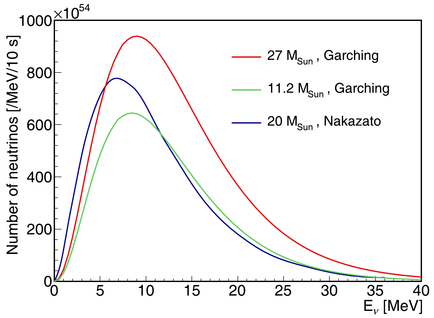 $ M_{p}=11.2\; M_{\odot} $ and$ M_{p}=27\; M_{\odot} $ via the LS220 EoS. Nakazato model with$ M_{p}=20\; M_{\odot} $ , Z (metallicity)$ =0.02 $ , and$t_{\rm rev}$ (the shock revival time)$ =200 $ ms is used for comparison.Data type Rate/s Calendar time Observed Expected DD 3.61× $ 10^{-3} $
