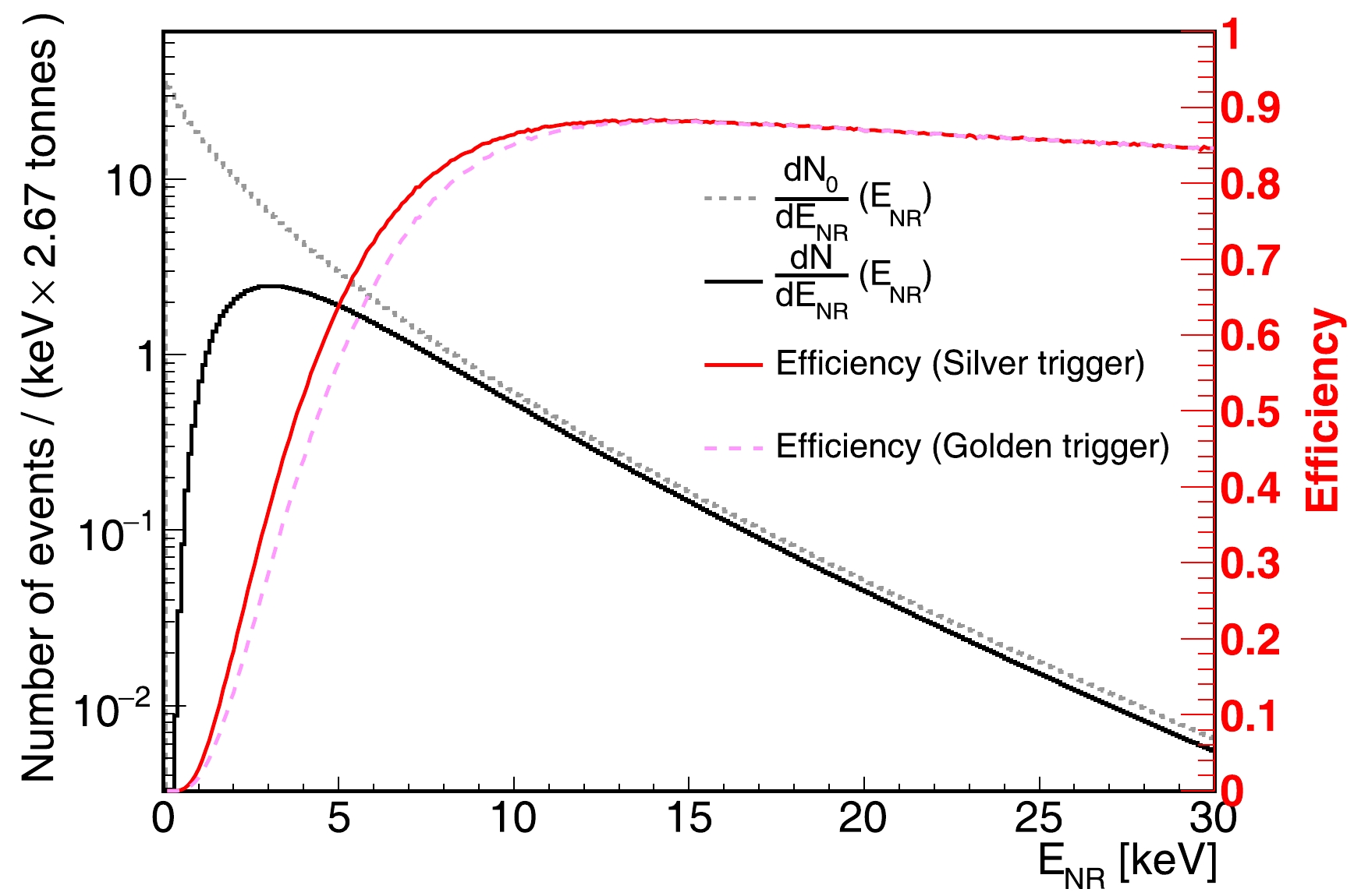 Figure 3. (color online) Detection efficiencies of silver trigger (red solid) and golden trigger (magenta dashed) as a function of NR energy; the expected neutrino spectrum before (gray) and after (black) the efficiency (red solid) correction. The Garching model with a progenitor mass of