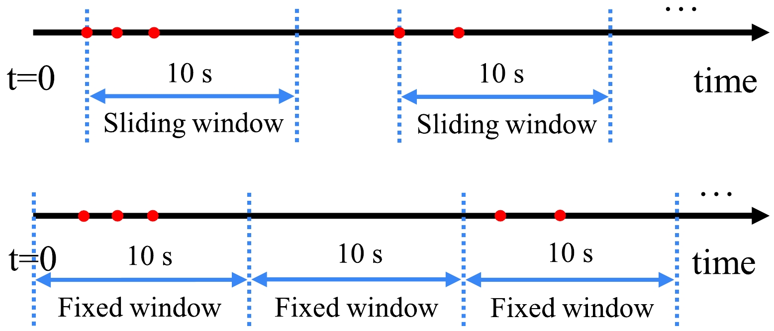 Figure 4. (color online) Schematic of the sliding and fixed time windows. The red dots represent SN neutrino candidates.
