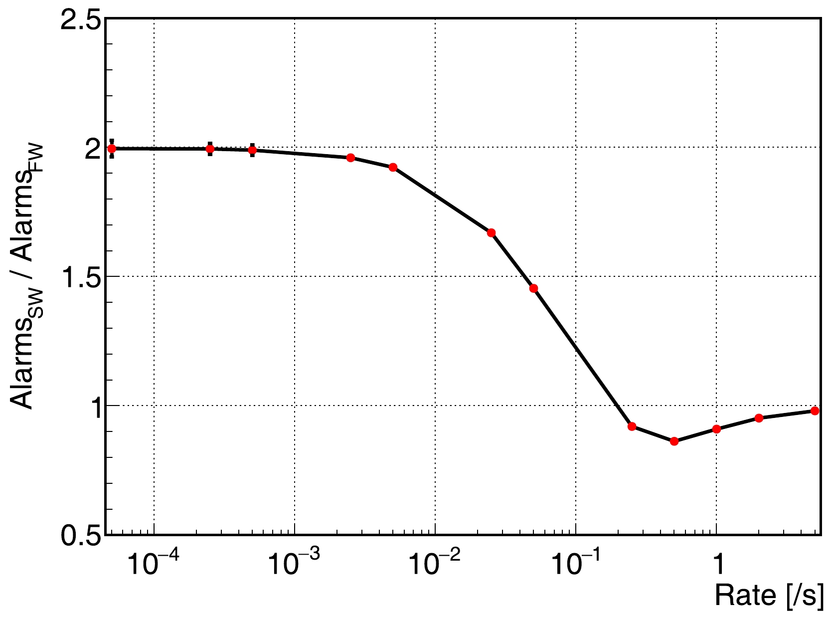 $ 10^{-3} $ s-1, the ratio gradually converges to 2. A mathematical explanation can be provided based on the the settings for this study. At the low rate, each alert comprises only two candidates with the parameters of$T_{\rm SN}=10$ s and$N_{\rm thr} =2$ ; this is because the probability of greater than two candidates appearing within 10 s is significantly lower than that of exact two candidates. If two candidates occur within a 10-s window in a total time length that can be divided into N intervals, with each interval being 5 s and N being sufficiently large, there are 3N/2 and N/2 scenarios for two candidates occurring in different intervals for the SW and FW methods, respectively, whereas the number of the scenarios for two candidates occurring in same intervals is N/2. Therefore, the ratio is$(3N/2+N/2)/ (N/2+N/2)=2$ . A ratio of 2 can also be explained as ($ r_{\rm bg}\times10 $ s)/($ r_{\rm bg}\times5 $ s) because the first candidate appears at the start (middle on average) of a 10-s window for the SW (FW) method. Note that the number of false alerts expected from Eq. (11) agrees with the number counted from the toy MC simulation using the FW method. In contrast to the SW method, the FW method divides the time length into uniform intervals according to the time window$ T_{\rm SN} $ and counts the false alerts within each interval. Second, the ratio reduces to a value below 1 because, with a higher rate, the possibility of more than two CEνNS events piling up in a single sliding window increases, leading to fewer triggers. Third, the ratio converges to 1 at a high event rate greater than 5 s-1 as the two methods exhibit negligible differences in these cases. -