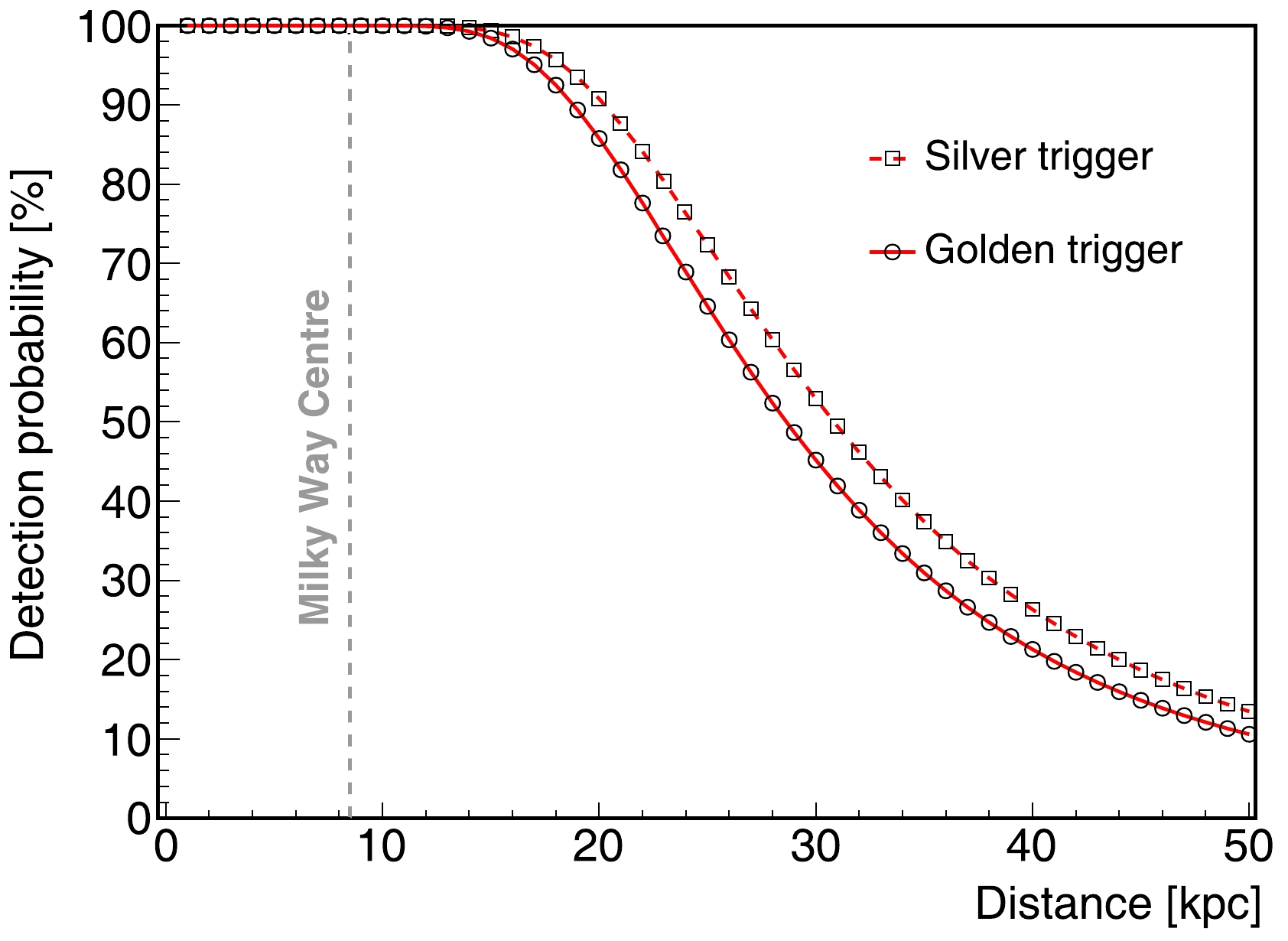 Figure 6. (color online) Detection probability of the SN explosion as a function of distance from the SN to Earth. The Garching model is used with
