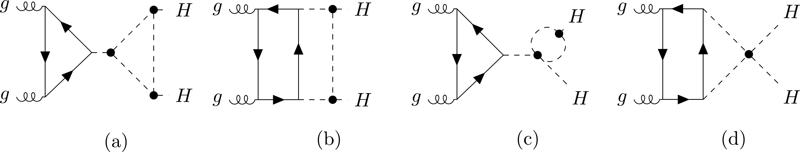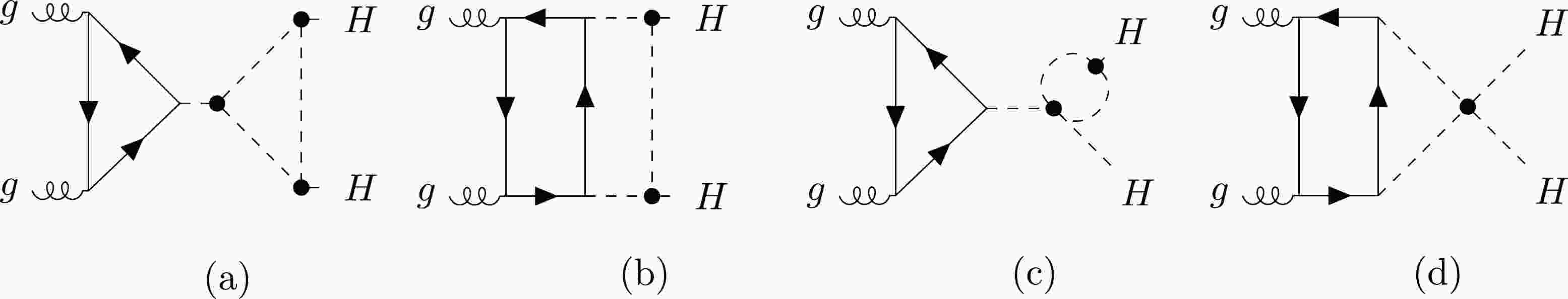 $\lambda^3_{{\rm{3H}}}~(a), \lambda^2_{{\rm{3H}}}~(b), \lambda_{{\rm{4H}}} \lambda_{{\rm{3H}}} ~(c)$ , and$\lambda_{{\rm{4H}}}~(d) $ , respectively.Our calculations for two-loop diagrams were realized as follows. We used FeynArts [54] to generate the Feynman diagrams and corresponding amplitudes. The amplitudes were expressed as a linear combination of two tensor structures with the coefficients called form factors [55]. After performing the Dirac algebra with FeynCalc [56−58], we obtained scalar integrals for each form factor. Rather than reducing all scalar integrals to master integrals and establishing differential equations for these master integrals, we directly computed the scalar integrals for specific phase space points employing the numerical package AMFlow [59, 60]. This decision was motivated by the intricate nature of constructing differential equations, particularly with general kinematic dependencies, which can be exceedingly time-consuming. Even if the differential equation is derived, obtaining an analytical solution appears infeasible with current technologies owing to the presence of massive propagators. Numerical solutions of these differential equations often suffer from accuracy loss. By contrast, direct numerical calculation at each phase space point ensures accuracy. The primary challenge lies in covering the entire phase space efficiently. Fortunately, the process of