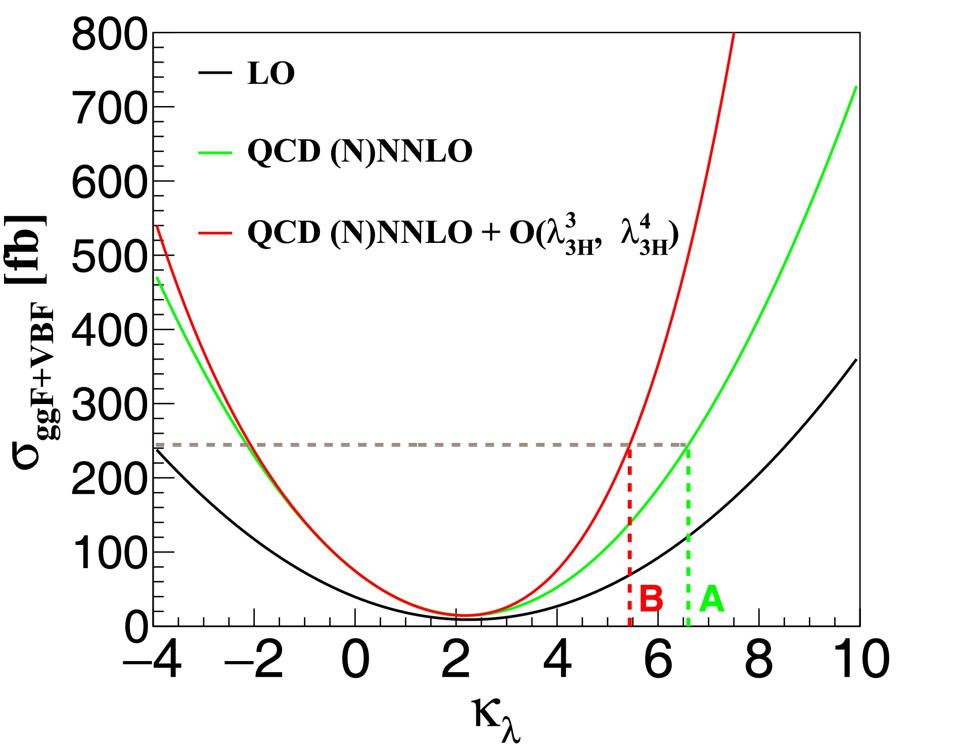 $ \kappa_{\lambda_{{\rm{3H}}}}=\kappa_{\lambda_{{\rm{4H}}}}=\kappa_{\lambda} $ . The black line represents the LO results, whereas the green line denotes the results with (N)NNLO QCD corrections in the ggF (VBF) channel. The red line indicates the results including higher power dependence on the Higgs boson self-coupling. The current and improved upper limits are labeled by points A and B, respectively.Lastly, the Higgs boson pair invariant mass