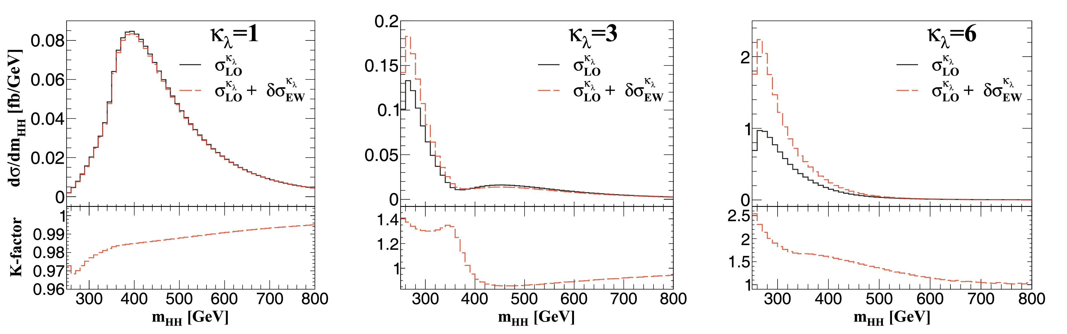 $ \lambda_{{\rm{3H}}}^3 $ ,$ \lambda_{{\rm{3H}}}^2 $ ,$ \lambda_{{\rm{4H}}} \lambda_{{\rm{3H}}} $ ,$ \lambda_{{\rm{4H}}} $ to the amplitudes. As a result, the cross section contains new quartic and cubic powers of$ \lambda_{{\rm{3H}}} $ and starts to be sensitive to the quartic Higgs self-coupling$ \lambda_{{\rm{4H}}} $ . Our objective is to assess these corrections, denoted by$ \delta \sigma_{{\rm{EW}}}^{\kappa_\lambda} $ , and their impact on the constraints on the Higgs self-couplings.